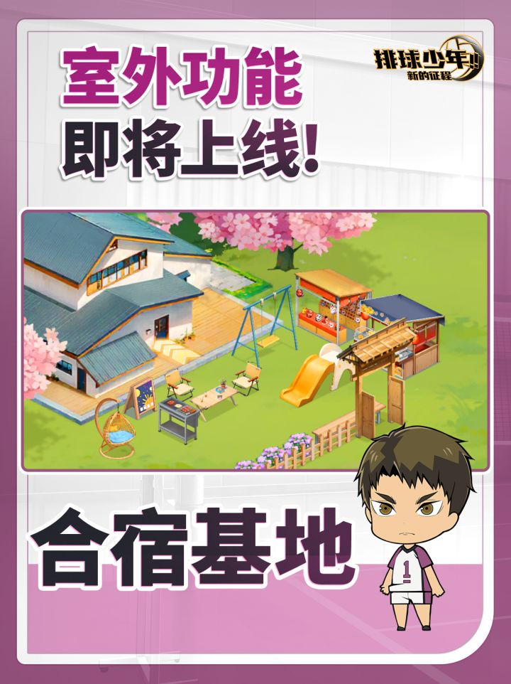 🏠合宿基地即将开放室外功能;室外家具也将上新:美丽的樱花树、团建烤肉架、秋千、滑梯、面具摊……室外更广阔的区域等你搭建!#排球少年 #排球少年手游 #排球少年新的征程 #排球少年1025新的征程 #观念之战