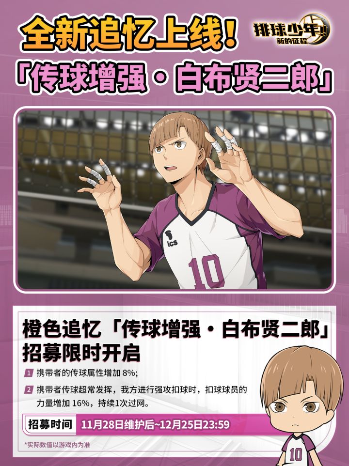 ▶全新UR球员「牛岛若利(OP)」、SSR球员「白布贤二郎(S)」登场!限时主题招募开启;▶红色限定追忆「意识增强·牛岛若利」、橙色限定追忆「传球增强·白布贤二郎」招募限时开启。▷白鸟泽学园高中主题活动「观念之战」限时开启,参与可获得白鸟泽学园横幅、超级招募券、追忆招募券等活动奖励。▷「白布贤二郎(S)」坚实派二传手招募活动开启,“绝对王者”活动、特训签到活动、累计充值活动限时开启。▷新增