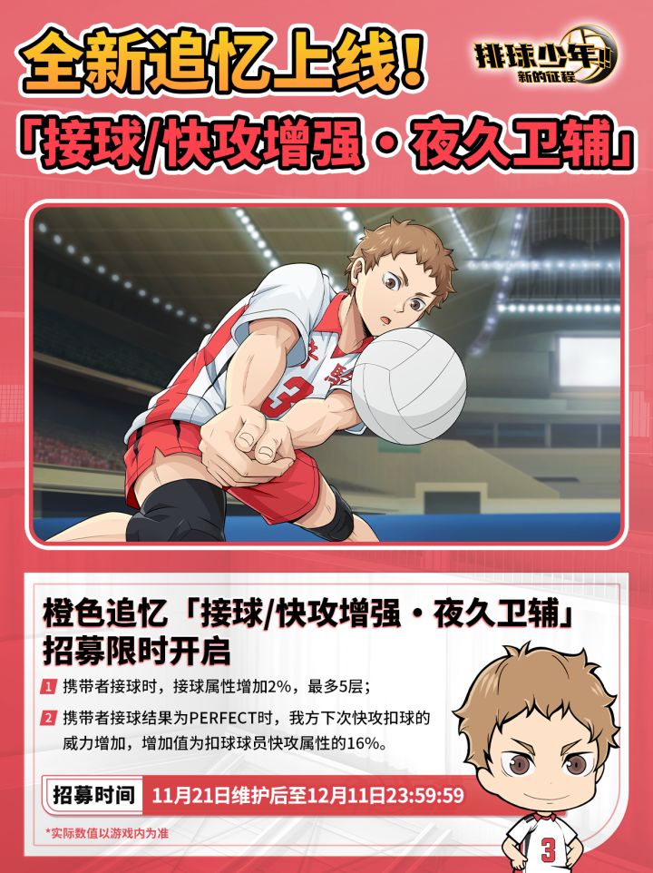 ▶全新SSR球员「夜久卫辅(Li)」登场!特殊招募限时开启;▶橙色限定追忆「接球/快攻增强·夜久卫辅」招募限时开启。▷限时活动“夜久卫辅登场”开启,参与可获得钻石、高级招募券等活动奖励。▷更新第三期连战对决限时关卡;更新第二期排球通行证;开放故事至第七章;全新Q版头像、背景上线。▷新增「观念之战」超值预购礼包,购买可获得超级招募券、追忆招募券等好礼。🕘游戏服务器将于11月21日09:00