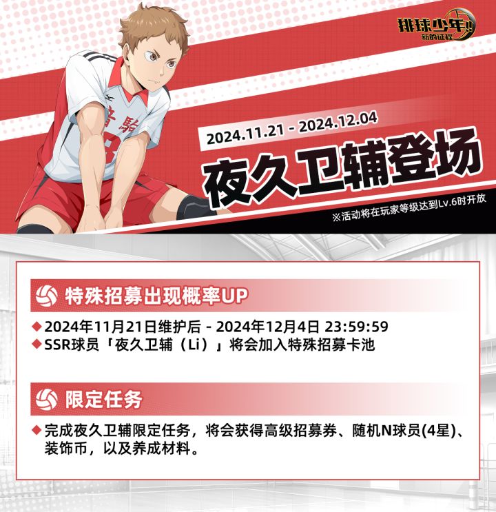 📆活动时间:2024年11月21日维护后-2024年12月4日23:59:59🏐SSR球员「夜久卫辅」将会加入特殊招募卡池,期间特殊招募出现概率UP!✅限定任务:活动时间完成夜久卫辅限定任务,将会获得高级招募券、随机N球员(4星)、装饰币,以及养成材料。#排球少年 #排球少年手游 #排球少年新的征程 #排球少年1025新的征程 #宿命对决
