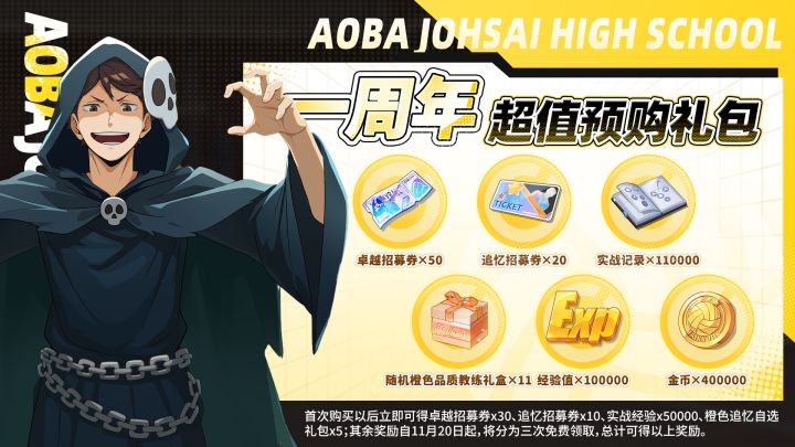 🎁【一周年】超值预购礼包上线!购买可获得:「卓越招募券」*50「追忆招募券」*20「实战记录」*110000「随机橙色品质教练礼盒」*11等海量资源。详细【一周年】超值预购礼包内容可见图片预览。#排球少年 #排球少年手游 #排球少年新的征程 #排球少年1025新的征程 #一起来玩排球手游