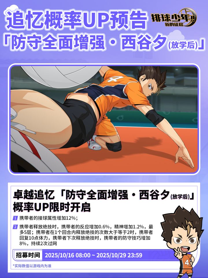 【悠哉假期】主题招募🏐10月16日复刻决定!——“在排球场上,只要球没有落地,就不会输。”▶▶西谷夕(放学后)◀◀▶▶稀有度:SP◀◀▶▶定位:自由人(Li)◀◀▷▷开放时间:2025年10月16日08:00 - 10月29日23:59🏐卓越追忆招募限时开启:「防守全面增强・西谷夕(放学后)」。羁绊介绍 | 西谷夕(放学后)🌟乌野的天才们西谷夕(放学后) & 影山飞雄🏐效果触