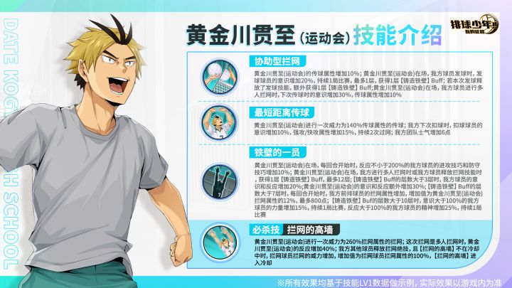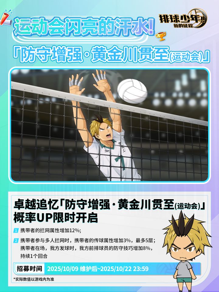 【黄金川贯至(运动会)】稀有度:SP定位:二传手(S)▷▷卓越招募时间:2025年10月9日维护后 ~ 10月22日23:59 【技能介绍】一技能:协助型拦网黄金川贯至(运动会)的传球属性增加;黄金川贯至(运动会)在场,我方球员发球时,发球球员的意识增加,获得1层【铸造铁壁】Buff;若本次发球释放了发球技能,额外获得1层【铸造铁壁】Buff;黄金川贯至(运动会)在场,我方球员进行多