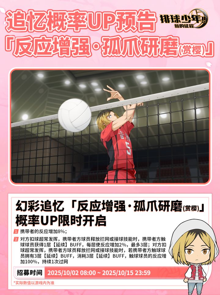 【一起赏樱吧!】主题招募🏐10月2日复刻决定!——“即便一开始似乎难以通关的游戏,只要不断挑战,也会习惯的。”▶▶孤爪研磨(赏樱)◀◀▶▶稀有度:SP◀◀▶▶定位:二传手(S)◀◀▷▷开放时间:2025年10月2日08:00 - 10月15日23:59🏐卓越追忆招募限时开启:「反应增强・孤爪研磨(赏樱)」。羁绊介绍 | 孤爪研磨(赏樱)🌟赏樱日向翔阳(赏樱) & 孤爪研磨(赏樱)