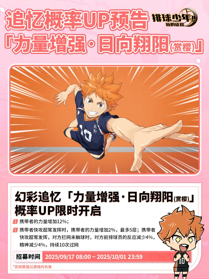 【一起赏樱吧!】主题招募🏐9月17日复刻决定!——“如果你是君临球场的王者!我就要打败你,成为站在球场上时间最长的人…!!!”▶▶日向翔阳(赏樱)◀◀▶▶稀有度:SP◀◀▶▶定位:副攻手(MB)◀◀▷▷开放时间:2025年9月17日08:00 - 10月1日23:59🏐卓越追忆招募限时开启:「力量增强・日向翔阳(赏樱)」。羁绊介绍 | 日向翔阳(赏樱)🌟怪物组合日向翔阳(赏樱)#一起来玩排球手游