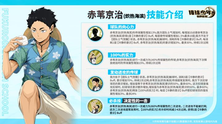 【赤苇京治(炽热海滨)】稀有度:SP定位:二传手(S)▷▷卓越招募时间:2025年7月24日维护后 ~8月6日23:59 【技能介绍】一技能:球队的向心力赤苇京治(炽热海滨)的传球属性增加;我方团队士气增加时,使赤苇京治(炽热海滨)获得【冷静的意识】Buff,每层使传球属性增加;我方不处于【团队士气觉醒】状态,赤苇京治(炽热海滨)触球时,消耗所有【冷静的意识】Buff,赤苇京治(炽热