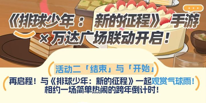 《排球少年:新的征程》×万达广场跨年倒计时即将开启!欢迎各位玩家参与,一起放飞气球!↓活动详情请往下滑↓🎉跨年倒计时活动「结束」与「开始」即将开启✨再启程!与《排球少年:新的征程》一起【观赏气球雨】、【放飞气球】!相约一场简单热闹的跨年倒计时!🎁【观赏气球雨】12月31日当日,按规则出示游戏主界面可领取「铝膜气球」(随机角色)一个。▶气球雨落下后,气球中还藏有额外中奖卡片!可凭卡片在服