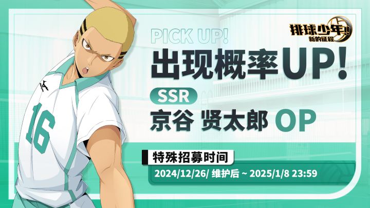 ▶▶特殊招募概率UP时间◀◀12月26日维护后 - 1月8日23:59🏐【京谷贤太郎】特殊招募主题卡池现已开启,活动时间获取概率提升!🏐可消耗「特殊招募券」招募该卡池中球员「京谷贤太郎(OP)」。#排球少年 #排球少年手游 #排球少年新的征程 #排球少年1025新的征程 #统整音驹的司令塔