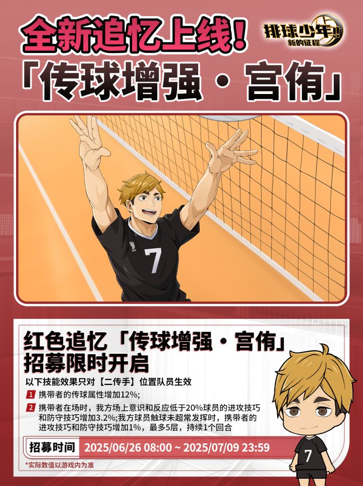 6月26日 ~ 7月9日,新SP球员「菅原孝支 - 放学后(S)」、UR球员「宫侑(S)」招募概率限时UP!菅原孝支(放学后)主题活动「悠哉假期」限时开启,参与可获得Q版头像、卓越招募券等奖励!✨精彩活动内容提炼:1. 全新 SP球员「菅原孝支 - 放学后(S)」登场;新卓越追忆「基础属性增强 · 菅原孝支(放学后)」上线!2. UR球员「宫侑(S)」,红色追忆「传球增强 · 宫侑」复刻!3