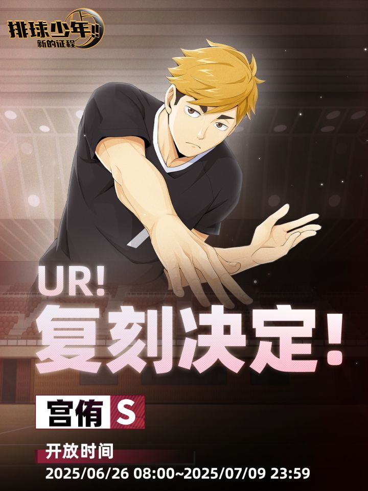 【高中NO.1的二传手】主题招募🏐6月26日复刻决定!——“用发球直接从擅长接球的人手里拿下分数,真是让人爽到不行啊~”▶▶宫侑◀◀▶▶稀有度:UR◀◀▶▶定位:二传手(S)◀◀▷▷开放时间:2025年6月26日08:00 - 7月9日23:59🏐红色追忆招募限时开启:「传球增强 • 宫侑」。羁绊介绍 | 宫侑(S)🌟首领和主轴宫治 & 宫侑 & 北信介🏐效果解锁生效后,宫治