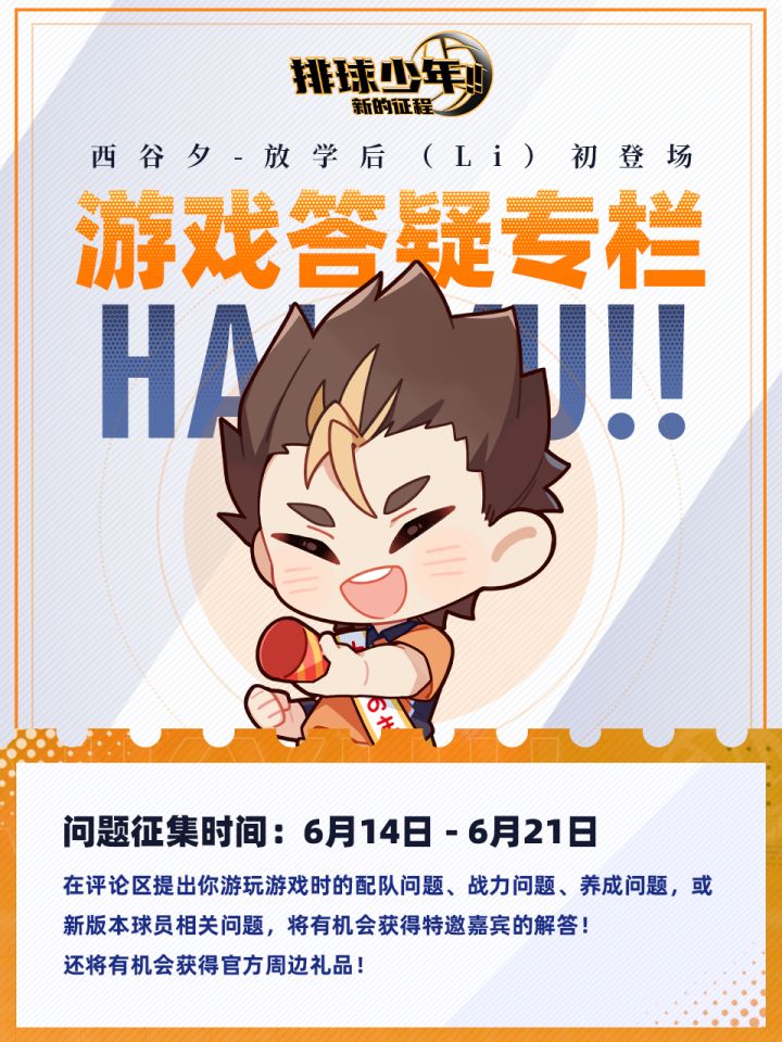 🔶随着新SP球员「西谷夕-放学后(Li)」登场,你是否有些疑问:🔸「西谷夕-放学后(Li)」潜能如何搭配比较好?🔸什么样的配队更适合「西谷夕-放学后(Li)」?🔸怎么样才能完美触发「西谷夕-放学后(Li)」技能机制?▶问题征集时间:6.14-6.21▶来评论区提出你对「西谷夕-放学后(Li)」疑问,后续将特邀嘉宾进行细致解答!🎁截止2025年7月6日23:59,关注账号@排球少年手游#一起来玩排球手游