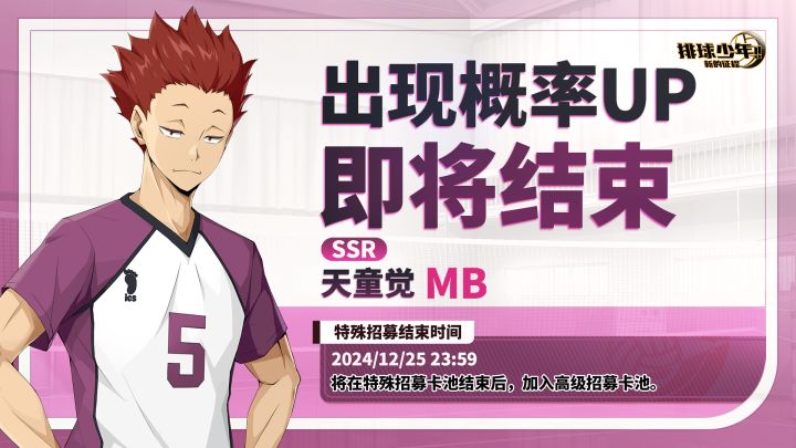 ◆特殊招募卡池「天童觉(MB)」 ▷招募概率UP时间:2024年12月12日维护后-2024年12月25日23:59 ◎SSR球员「天童觉(MB)」将在特殊招募卡池结束后,加入高级招募卡池。 ◎橙色追忆「拦网增强·天童觉」将会在限定追忆招募结束后,加入追忆招募卡池。#排球少年 #排球少年手游 #排球少年新的征程 #排球少年1025新的征程 #观念之战