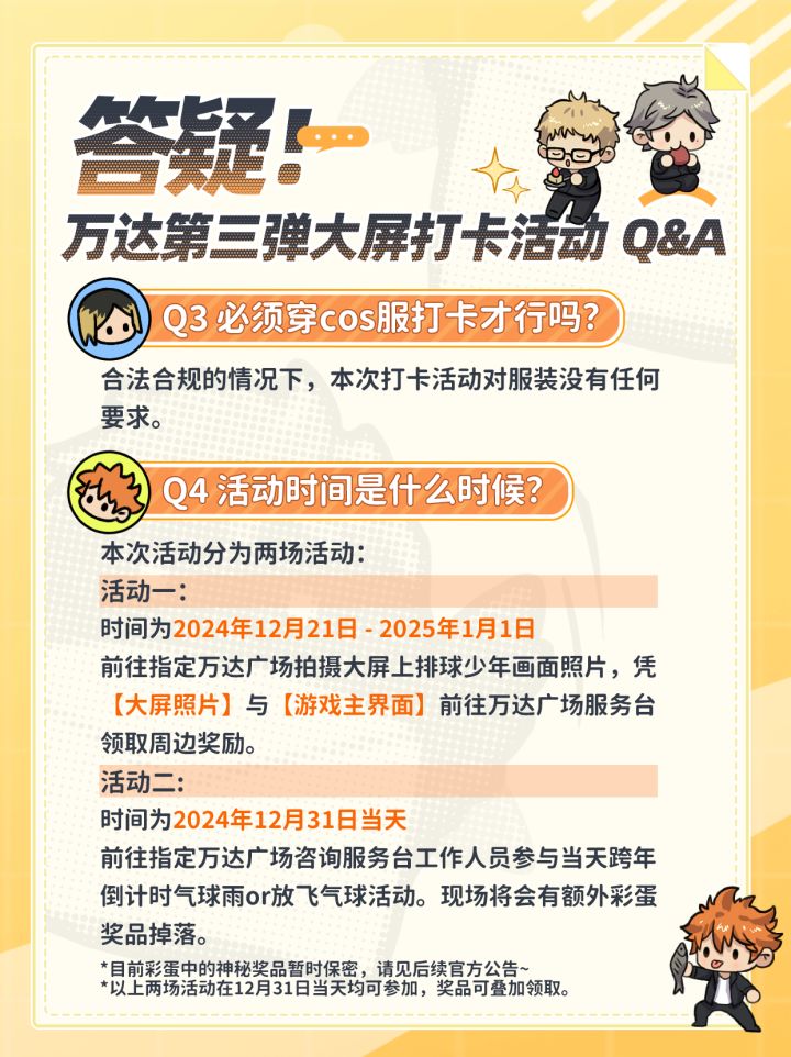 前排放置万达大屏打卡活动时间:📆2024年12月21日-2025年1月1日不要错过!🎈《排球少年:新的征程》与万达广场即将开启第三弹大屏打卡活动!✨活动即将开启,我们收到了不少玩家的积极响应,也有许多玩家提出疑问。✨针对频繁出现的问题,我们准备了一份详细的「Q & A」解答。✨欢迎点击图片查看答疑,快来看看有没有为你答疑解惑吧!🍀如果还有更多问题,欢迎在评论区发出你的疑问~截止202