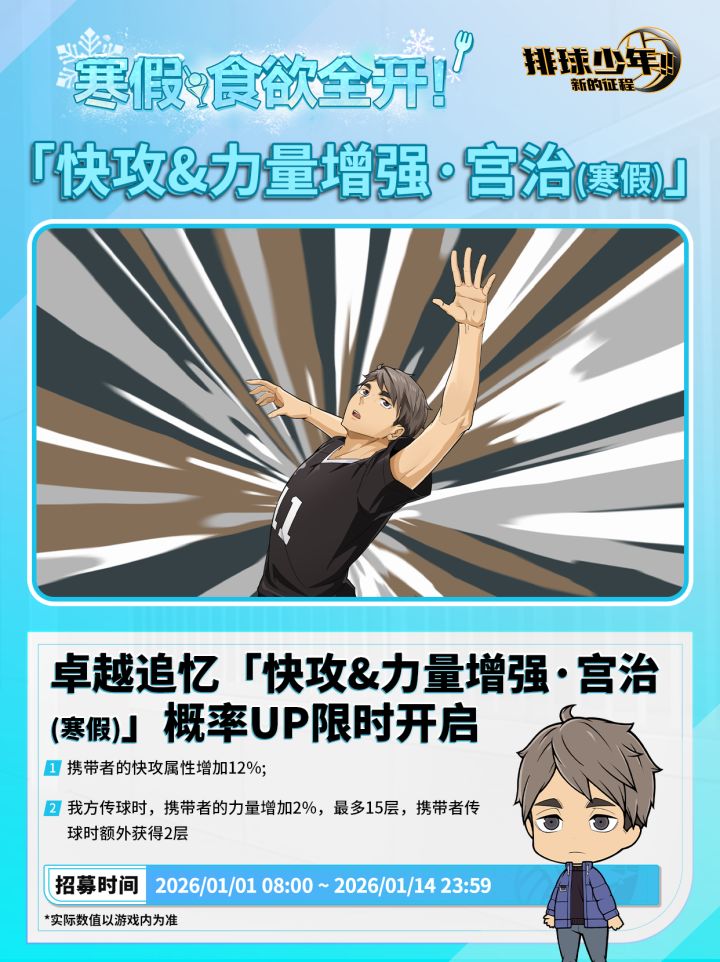 【宫治(寒假)】稀有度:SP定位:接应(OP)▷▷卓越招募时间:2026年1月1日8:00 ~ 1月14日23:59 【技能介绍】一技能:极速快攻宫治(寒假)的快攻属性增加;比赛开始时,宫治(寒假)的意识减少为0%,快攻扣球的威力增加;每回合结束时,宫治(寒假)的意识减少为0%。二技能:纯熟的传球宫治(寒假)进行一次传球属性的传球;宫治(寒假)在场,我方球员释放传球技能时,【纯熟