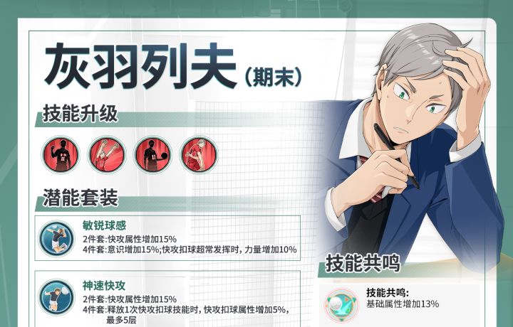 🏐《排球少年:新的征程》SP球员「灰羽列夫-期末(MB)」招募开启。📚 「灰羽列夫-期末(MB)」拥有天生的资质和体格,是音驹暂不成熟的王牌候补!📚 下面带你一张图了解「灰羽列夫-期末(MB)」适合的潜能套装、适配的追忆、技能共鸣介绍、角色独特羁绊、优质阵容组合!📚 快来点击图片查看详情~#排球少年 #排球少年手游 #排球少年新的征程 #排球少年1025新的征程 #一起来玩排球手游