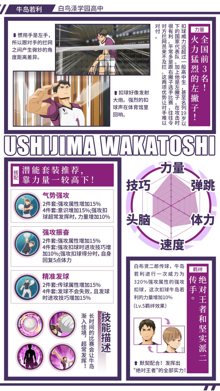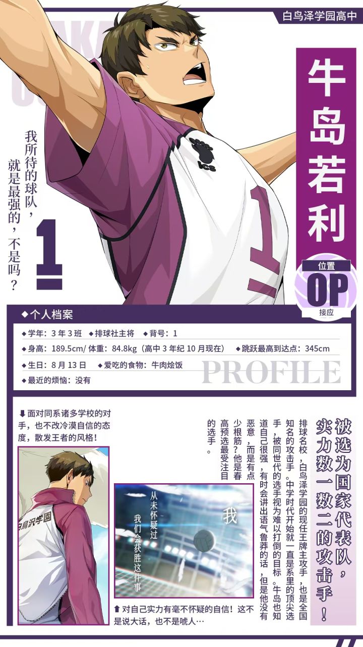 “我所待的球队,就是最强的,不是吗?🌟牛岛若利来自排球名校,白鸟泽学园。是白鸟泽学园高中排球部现任王牌主攻手,也是全国知名的主攻手。被选为国家代表队,实力数一数二的攻击选手!🌟牛岛若利力量与体力强悍,扣球威力远超过一般高中生,在游戏里「牛岛若利(OP)」也很好的保留了这一特点。长时间的比赛会让「牛岛若利(OP)」渐入佳境,超常发挥!与「白布贤二郎(S)」可以组成羁绊【绝对王者和坚实派二传手