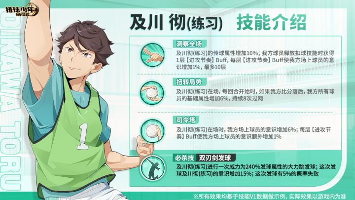 【及川彻(练习)】稀有度:SSR定位:二传手(S)▷▷特殊招募时间:2024年12月12日维护后-2024年12月25日23:59【技能介绍】一技能:洞察全场及川彻(练习)的传球属性增加;我方球员释放扣球技能时获得【进攻节奏】Buff。【进攻节奏】Buff使我方场上球员意识增加。二技能:扭转局势及川彻(练习)在场,每回合开始时,如果我方比分落后,我方所有球员基础属性增加。三技能: