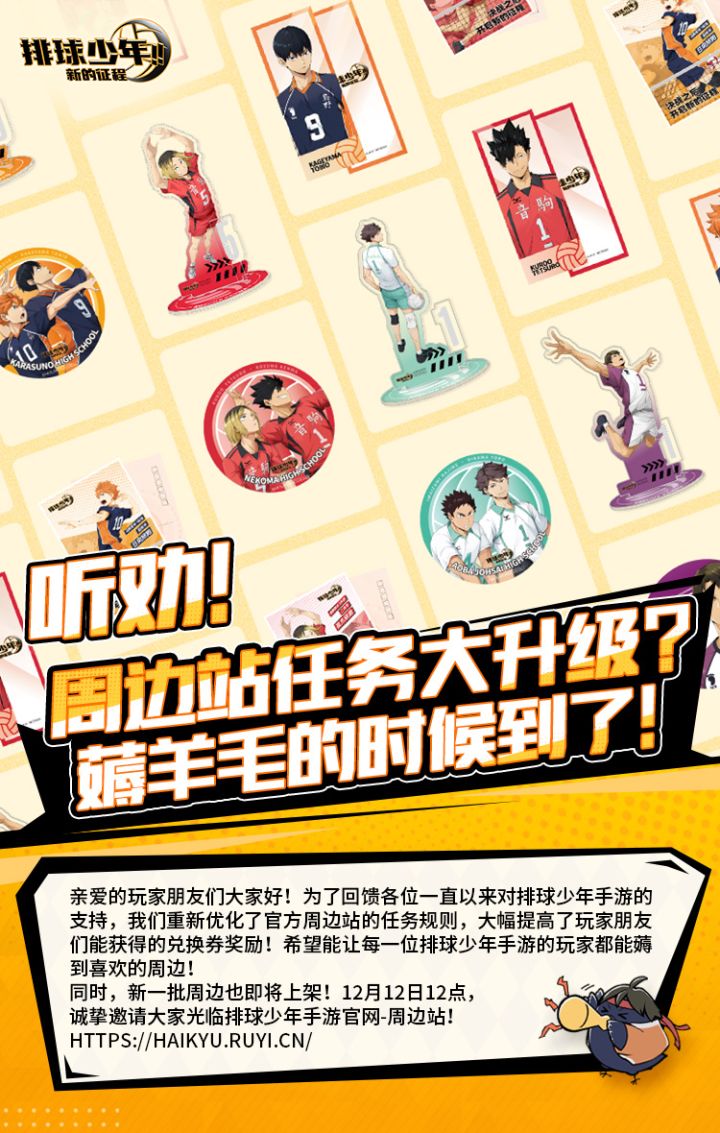 ✨周边站任务规则全面优化升级,大幅提高任务可得兑换券。✨助力所有支持《排球少年:新的征程》的玩家兑换排球少年手游手游官方周边!✨希望大家都能兑换到自己喜欢的周边~🎉12月12日12点,周边站上新升级,锁定排球少年手游官网-周边站!更多周边等你来拿!#排球少年 #排球少年手游 #排球少年新的征程 #排球少年1025新的征程 #观念之战