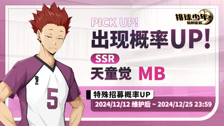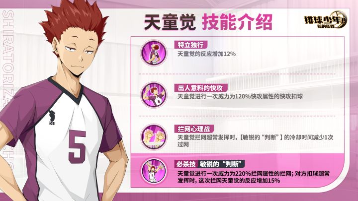 【天童觉】稀有度:SSR定位:副攻手(MB)▷▷特殊招募时间:2024年12月12日维护后-2024年12月25日23:59【技能介绍】一技能:特立独行天童觉的反应增加。二技能:出人意料的快攻天童觉进行一次快攻属性的快攻扣球。三技能:拦网心理战天童觉拦网超常发挥时,【敏锐的“判断”】的冷却时间减少。必杀技:敏锐的“判断”天童觉进行一次拦网属性的拦网;对方扣球超常发挥时,这次
