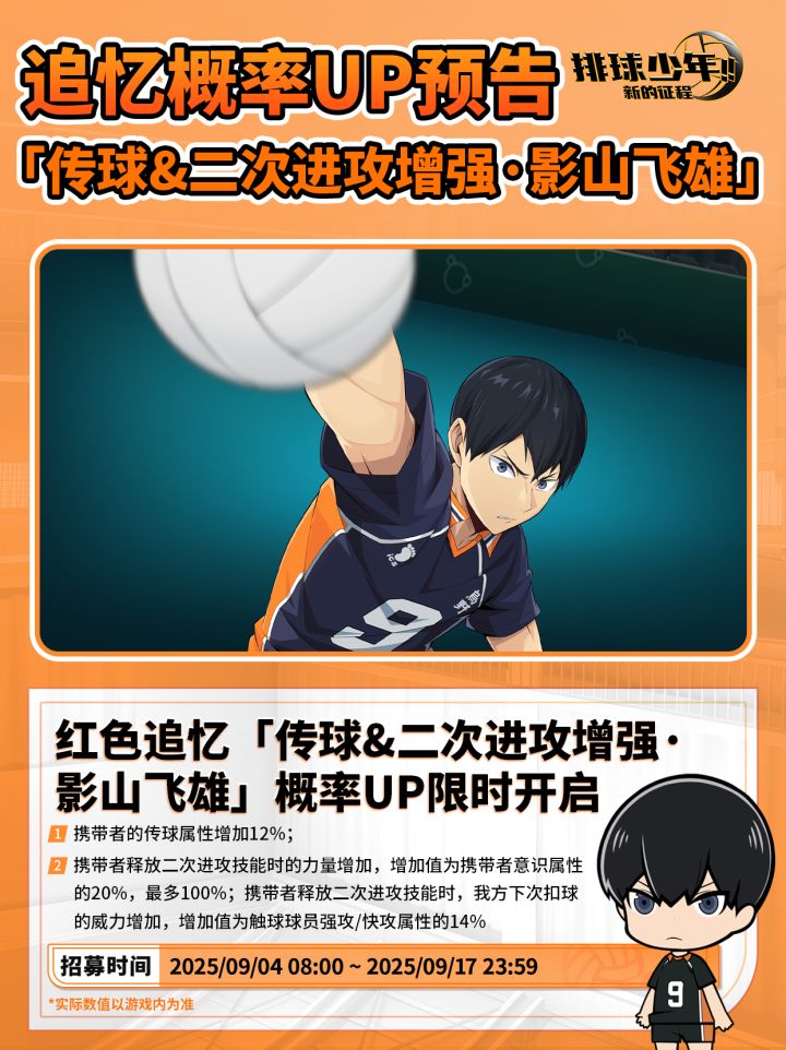 【球场上的王者】主题招募🏐9月4日复刻决定!——“打破挡在主攻手面前的墙壁,这就是二传手的意义。”▶▶影山飞雄◀◀▶▶稀有度:UR◀◀▶▶定位:二传手(S)◀◀▷▷开放时间:2025年9月4日08:00 - 9月17日23:59🏐红色追忆招募限时开启:「传球&二次进攻增强・影山飞雄」。羁绊介绍 | 影山飞雄(S)🌟青训队的二传手宫侑 & 影山飞雄🏐效果解锁羁绊后,影山飞雄【传