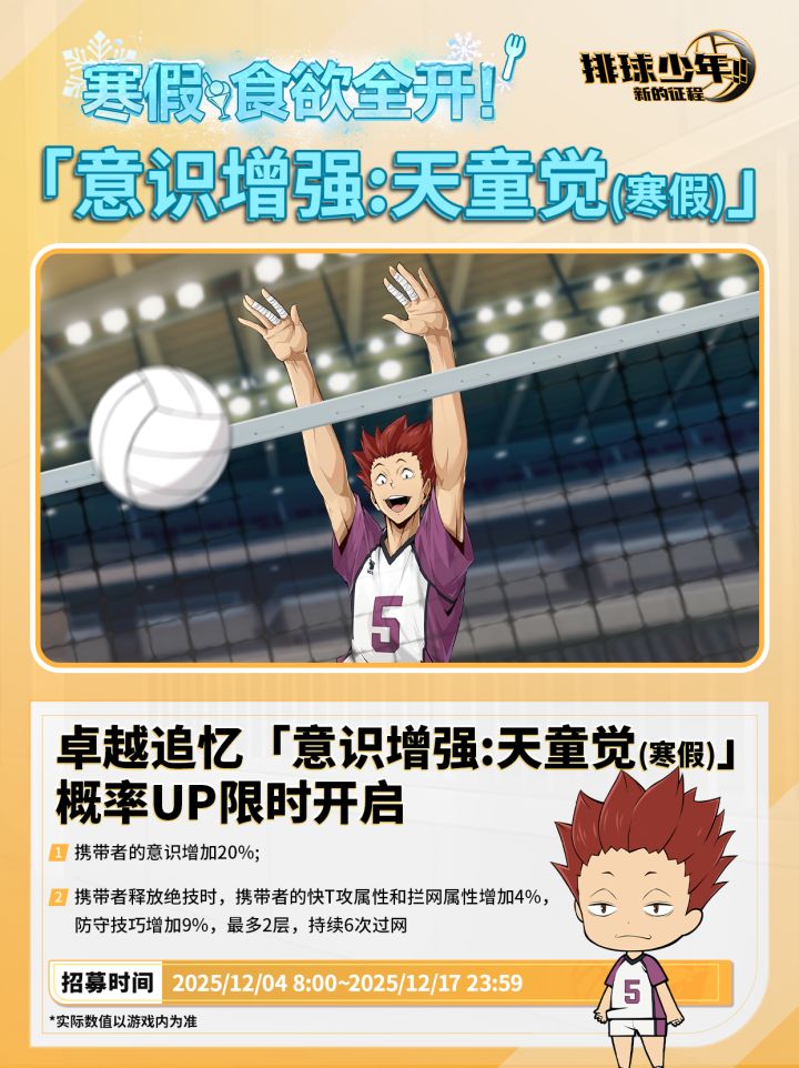 12月4日 ~ 12月17日,全新SP球员「天童觉-寒假(MB)」招募概率限时UP!参与同名主题活动「寒假、食欲全开!」限时开启,参与可获得天童觉(寒假)专属头像、卓越招募券等丰厚奖励!✨精彩活动内容提炼:1. 全新 SP球员「天童觉-寒假(MB)」登场;新卓越追忆「意识增强 · 天童觉(寒假)」上线!2. SP球员「青根高伸-炽热海滨(MB)」,卓越追忆「防守技巧&拦网增强 · 青根高伸(