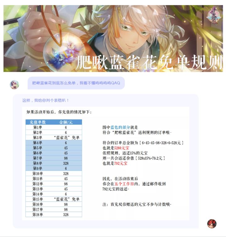 小可爱们黑五买买买快乐!游戏里节约真金白银的“拿去花——免单概率up”活动来咯!~今晚的18:00-20:59,你在游戏内充值时,触发“蓝雀花”而获得免单的概率会大幅提升!除了游戏内免单,肥啾也为大家推出了两大福利!来继续看吧~【黑五福利——“肥啾蓝雀花”】拯救非酋计划启动!“肥啾蓝雀花“来啦!1、活动期间,如果你连续六次充值未触发“蓝雀花”免单,将在活动结束后五个工作日内,通过游戏内邮