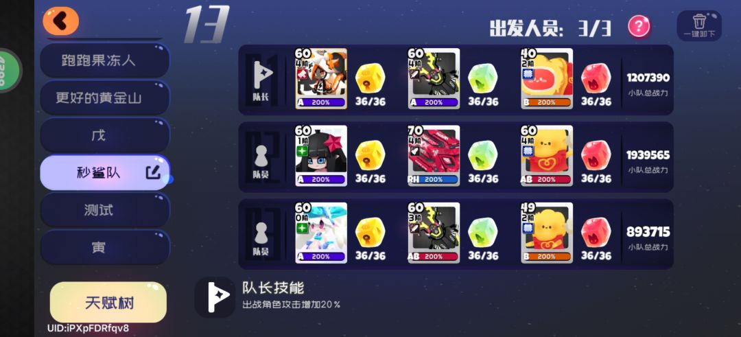 队长xh5,队员:凯莉+人鱼/小妖炽,亲测可秒所有关卡boss(凯莉武器红蜂,其他人用绿剪刀) 优点:能秒杀,高伤害 缺点:凯莉冷却时间太长(反正是秒杀队,凯莉带技能强度糖就行了,其他人CD糖) ◆不要用这个队伍打守护模式,守护模式用外界神+失落+一个可持续输出单位(外界队长带CD,跑得快很好玩,你的守护不再枯燥~) 破池子爆率能不能高点,多给我个凯佬你要怎样?一百八十抽了金小队都没凑齐一直给我歪