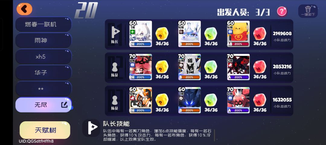 无尽是个很卷的地方,刚入坑萌新可以说完全无法触及,真要打的话有什么就上什么,下面讲的东西主要适用于一些中后期的玩家。 ﹉﹉﹉﹉﹉﹉﹉﹉分割线﹉﹉﹉﹉﹉﹉﹉﹉ 打法主要分复活和无复活俩种,先来讲讲复活流:顾名思义就是烧复活币的阵容,非常消耗资源,没有把握不要轻易尝试,不然得不偿失。对阵容组合需要的角色特征就是高爆发,常规的复活队一般为双c+hx5辅助,这种复活队上限较低,一般用于拿参与奖(300往后