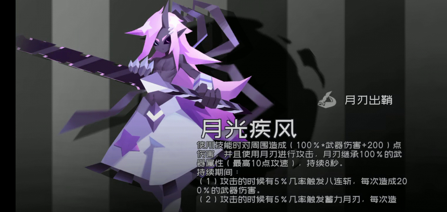 落樱·INF·曙月 【主动技能】(冷却时间40s):落樱聚集星月的力量,展开翅膀,变身为“月神落樱”,变身的期间全队无敌,变身结束后对全屏的敌人造成5555/6666/7777%武器攻击力的伤害。“月神落樱“状态下,隐藏武器,每隔0.13秒有50%的几率坠落下一道月光,造成555/666/777%攻击力的范围伤害,全体友方角色提升65%攻击力。20秒后解除变身。被月光攻击到的敌人施加1%破甲,持