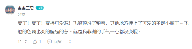 更新之后,飞船主界面焕然一新,变成了全新的圣诞主题。有没有发现很多全新的东西出现在了飞船里呢?寻找新增加的装扮,获取新的煤球玩偶吧!【参与方式】:在该帖下面直接罗列评论出新的变化改动,例如:月亮变成了有圣诞老人的月亮!!!!【参与奖励】:会从回复中抽取出幸运小果冻获得新版的煤球玩偶哦~【参与时间】:即日起至26日0点之前都可以参与~