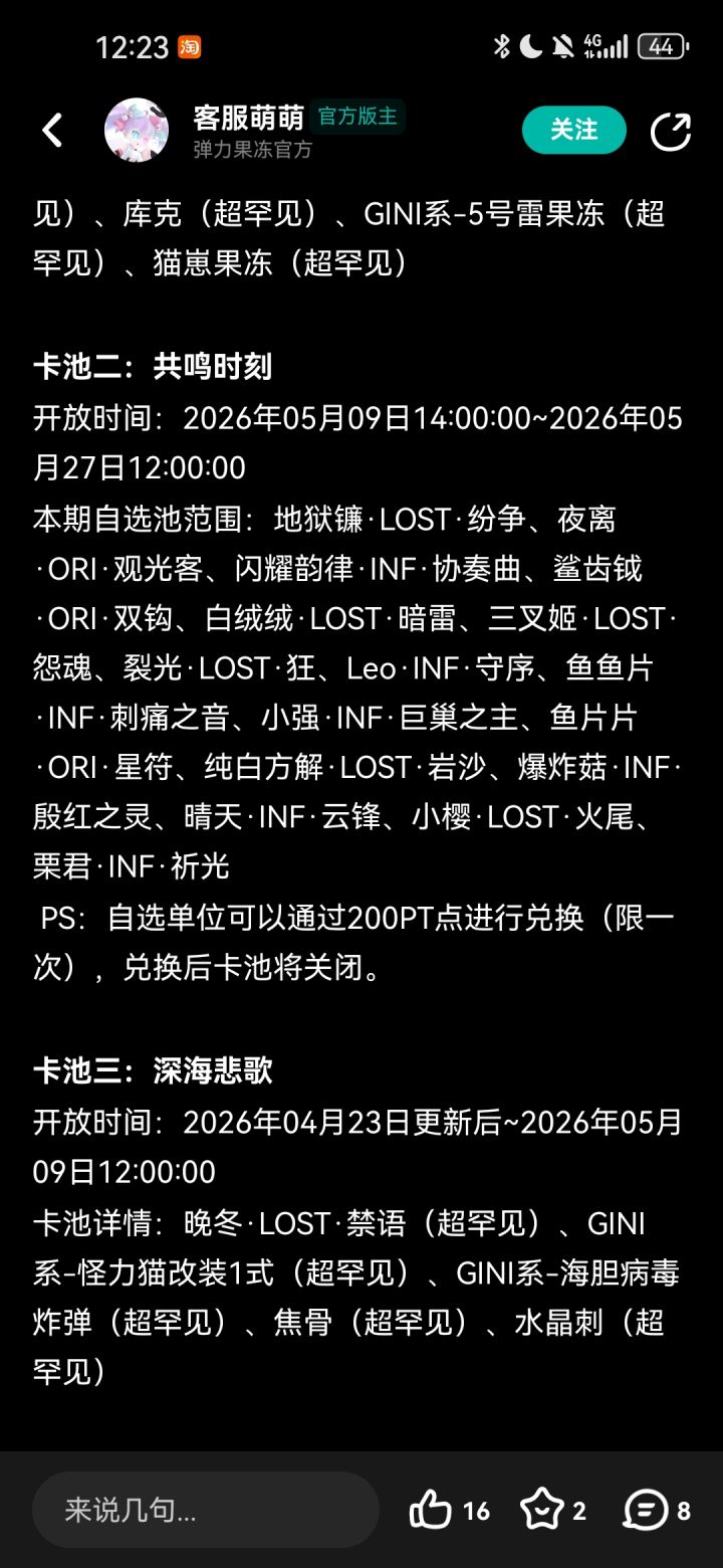 亲爱的小果冻们:我们将预计在2026年04月23日14:00-17:00,对服务器进行停机更新,整个过程预计需要3小时,在维护期间,您将暂时无法进行游戏,建议您提前结束关卡下线,给大家带来的不便,我们深表歉意。★维护区服:安卓,iOS★维护时间:2026年04月23日14:00-17:00★维护补偿:果冻币*1000,燃料*120,扫荡券*40。★更新内容:一、限时卡池开放卡池一:夏