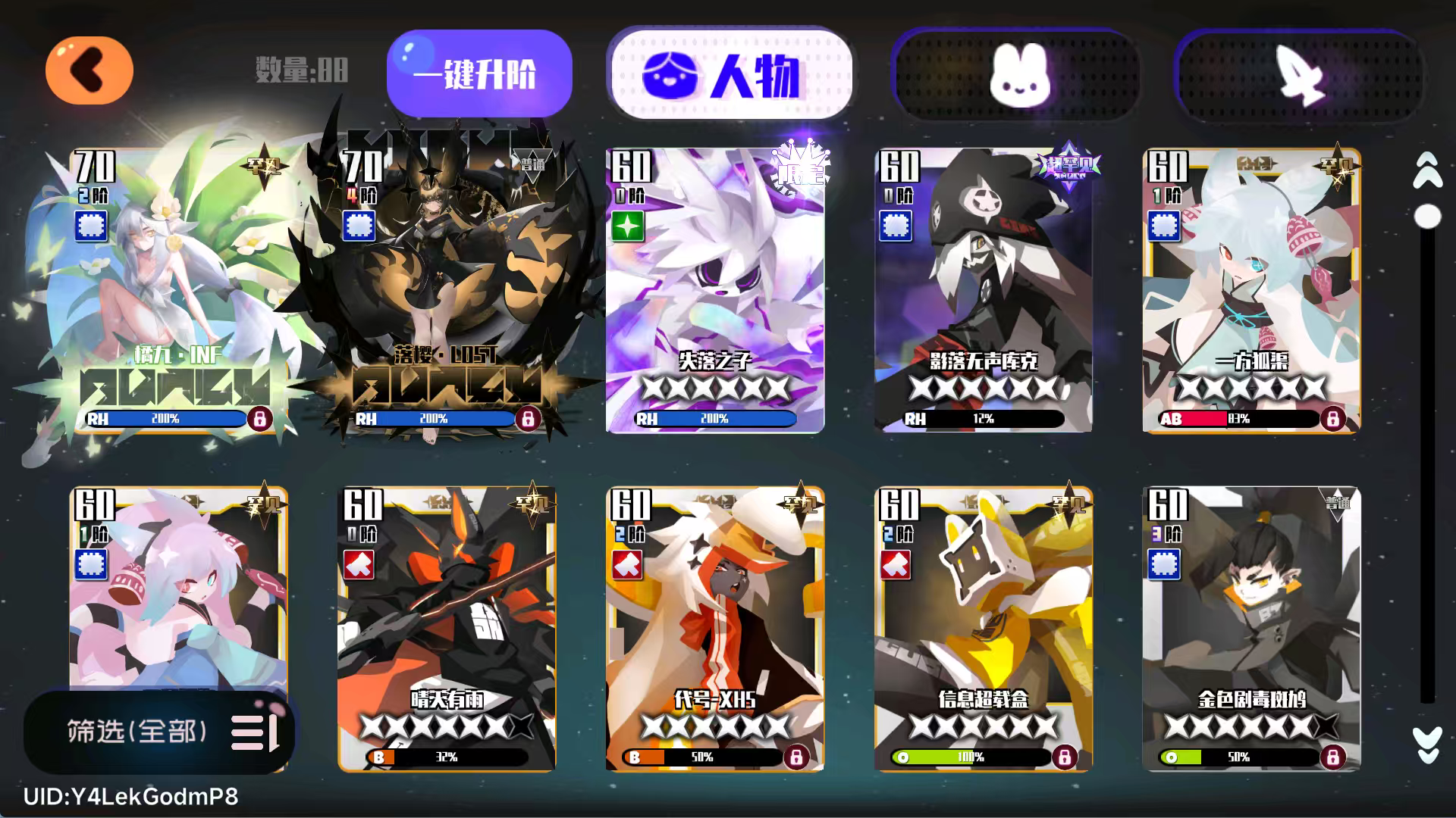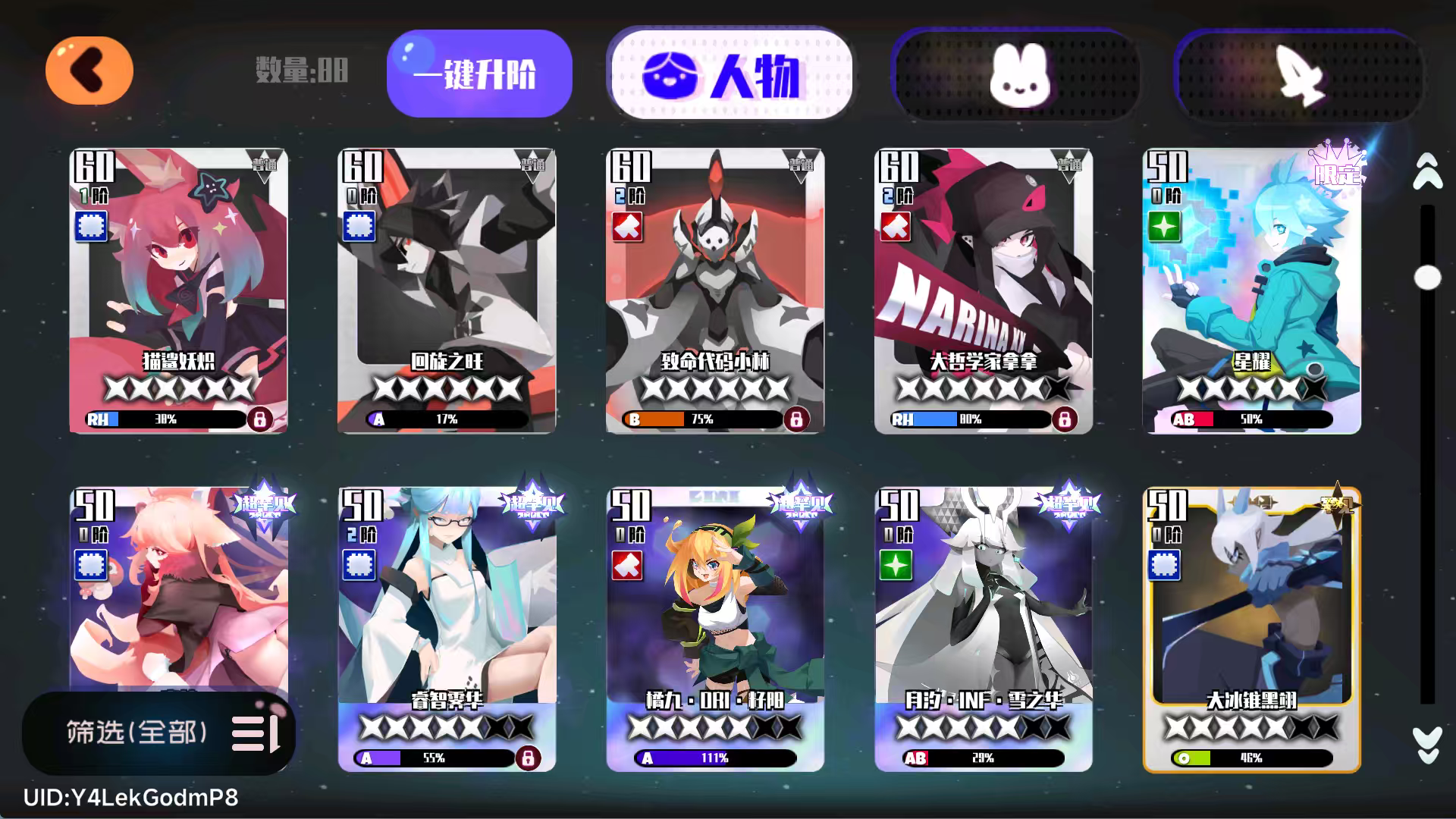 这概率比同行抽卡出货的概率都高了,7%超罕3%限定这是人啊(一看卡池超罕5%,那没事了),入坑俩月赌出霉梅,库克,maki,水桶,霁华,还有限定的洛然,狐渠虽然能用的就霉梅,库克持续出货之后,就蠢蠢欲动,老想分解赌盒子了,单从强度方面来说,好像没必要,从收集图鉴的角度,没保底,纠结