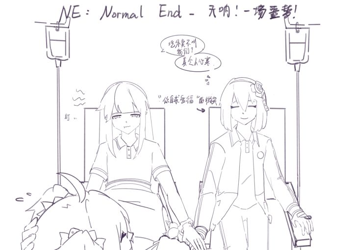 落樱:(盯)吃外卖不叫我们?真叫人心寒。橘九:(露出一个“你自求多福”的微笑)Normal end: 天呐!一场噩梦!结局介绍:食堂未炒熟的豆芽菜杀伤力不亚于菌子(虽然菌子更好吃点),把校内不少学生与教职人员都霍霍进了医院,据说还有高年级学长学姐回来收拾东西也中招了,莫名其妙的经历也许只是一场噩梦。此时不患寡而患不均,不巧,同班同宿舍的艾维没中招,更不巧,是因为她偷偷点了外卖吃独食。受到两个