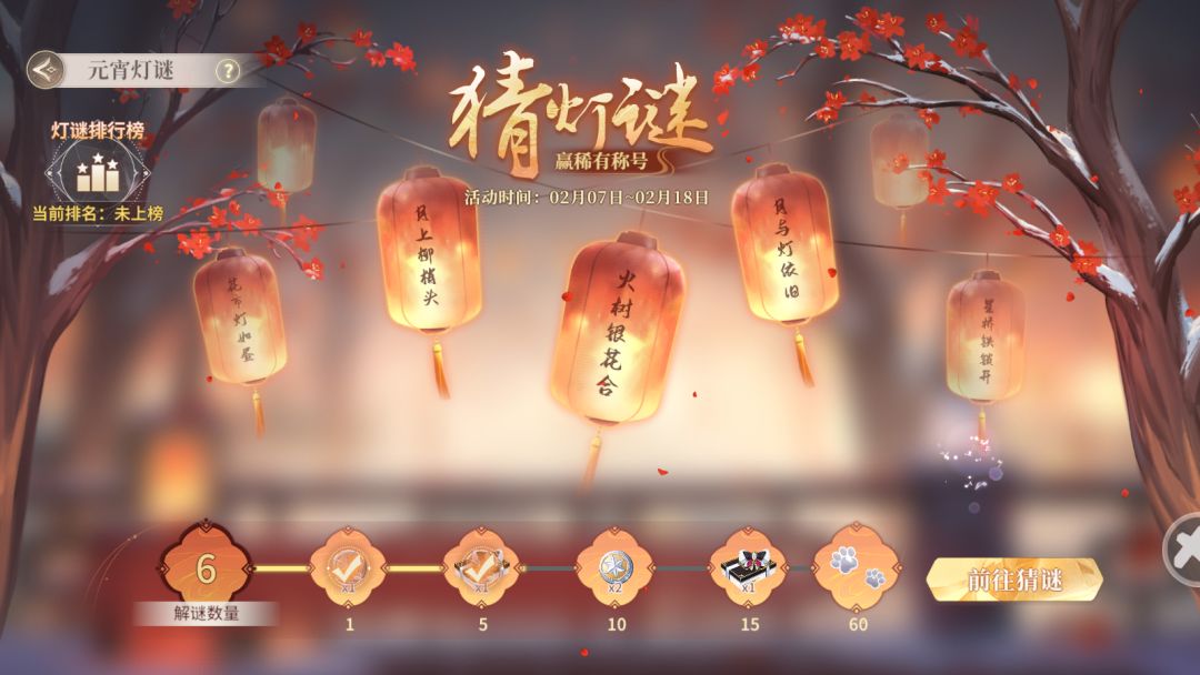小镇-圆梦广场 1.点点成金(打一字):全 位置:圆梦广场右手边大树下面的灯笼 2.十八姑娘一枝花(打一成语):成人之美 位置:圆梦广场许愿池旁的灯笼 3.登上南天门(打一字):阕 位置:圆梦广场许愿池左前方的灯笼 4.一粒谷,占满屋(打一物):灯 位置:圆梦广场左手边大树下的灯笼 5.山上复又山(打一字):出 位置:圆梦广场许愿池旁(音乐精灵小典右手边) 6.半部春秋(打一字) 答案:秦 位置: