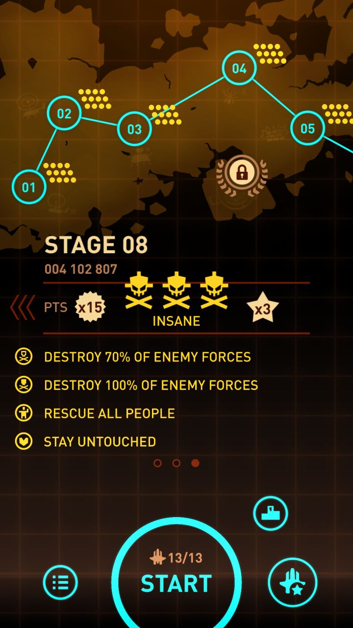 前前后后玩了大概两个月的时间吧,今天总算把最后一张卡片刷出来了,特来发表一个简易攻略。先说说战果吧,前10关全部12星通关,卡片飞机集齐,武器升级还差几个。首先是升级武器,个人建议优先升级翼炮,翼炮过量伤害可穿透目标,打小飞机可以一打多,然后是导弹,别看导弹只有两枚,但是伤害很足,特别是你解锁了最后一个导弹分裂飞机之后,导弹数量达到16枚,各种补刀不在话下,激光,护盾,核弹建议滞后升级,因为提