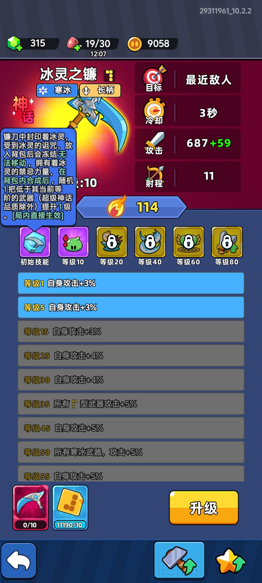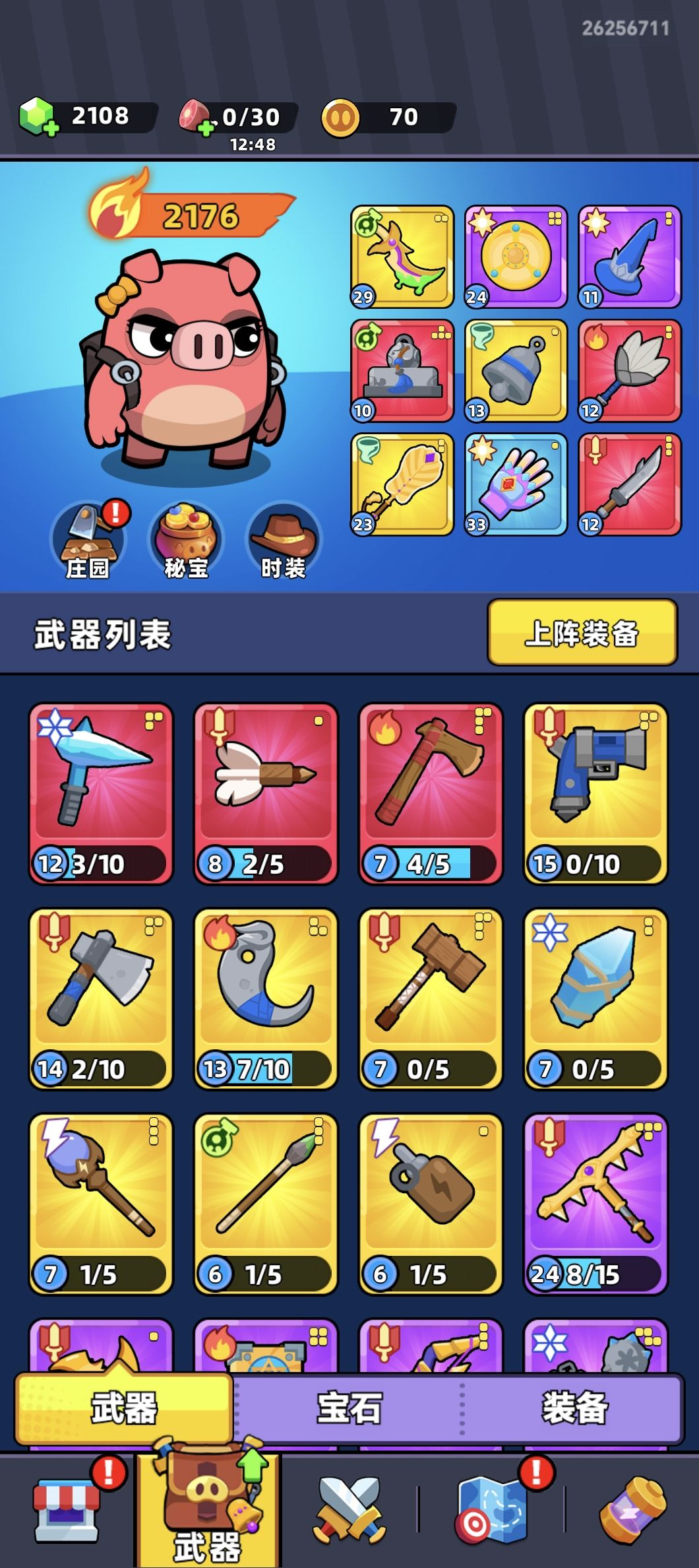 神话武器(红色)主要 朱雀扇(输出 穿 透) 御风书(禁锢 击退) 腰带(生命 极速恢复) 传说武器(金色)主要 芭蕉扇(击退 分裂) 磁暴手雷(减速(移动速度)) 铃铛(减速(攻击速度)) 史诗武器(紫色)主要 盾牌(血量 刷盾) 帽子(回血 增伤(限法术武器)) 寒冰杖(冰冻(BOSS只吃冰冻,减速和禁锢)) 蓝色武器主要 手套 (前期过度35级可以停止) 武器升级需要图纸和自身碎片 到一定等