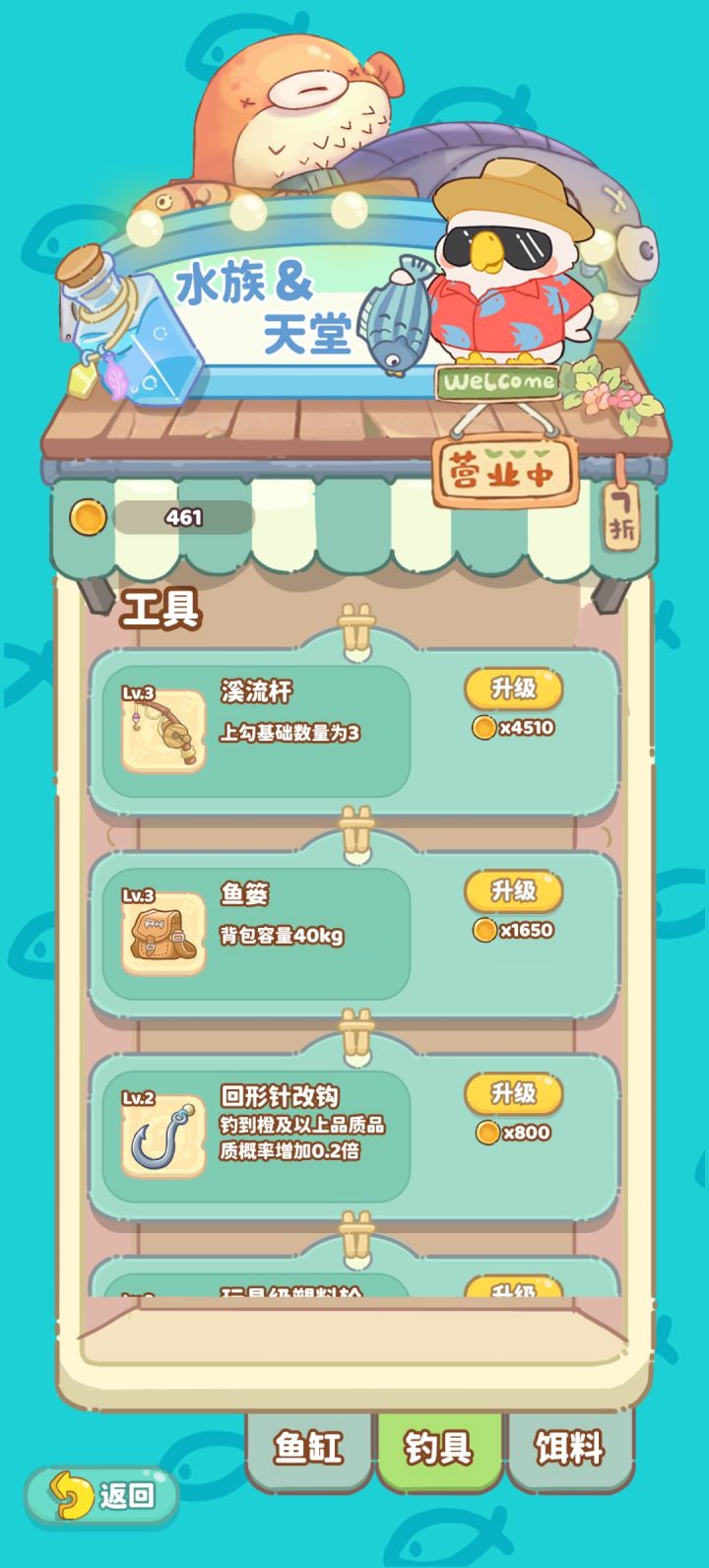 共61图鉴、21种鱼,每条鱼有三种图鉴(普通、彩色、金色)全水域:食人鱼(仅一种普通图鉴)浅滩水域:小丑鱼、圆瞳鱼、生气鱼、长吻鱼、惊恐鱼、黑恶势力鱼。中间水域:呆眼鱼、含蓄鱼、思考鱼生鱼、卡姿大眼鱼、懵逼鱼、开花鱼、鹦鹉鱼。较远水域:憨憨鱼,啵嘴鱼,乐子鱼,悲伤鱼,好斗长剑鱼,慢慢游鱼,灯笼鱼。鱼缸和鱼食满级20级,鱼竿5级,鱼箱、鱼钩、鱼轮、鱼线10级。