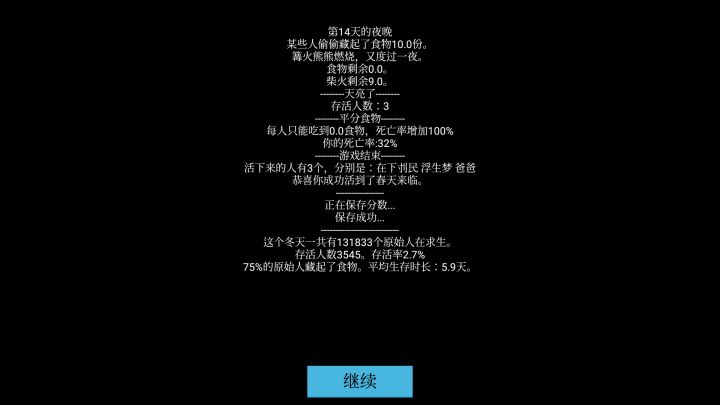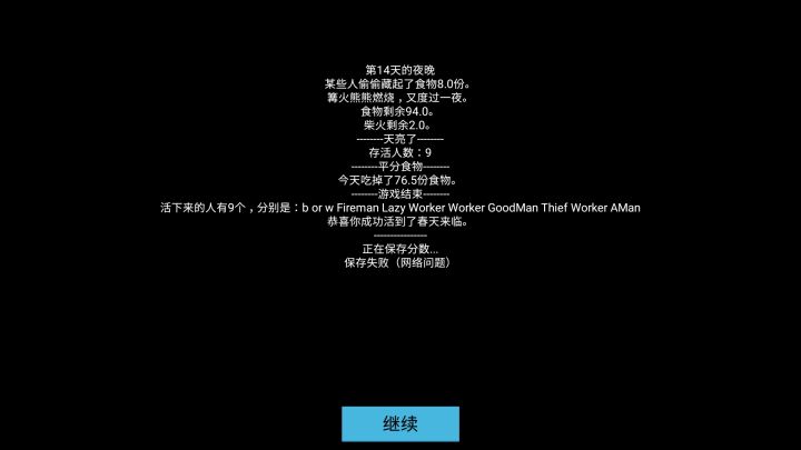 断网试了几局,最好结局是9人生还hero会死于打猎,即使是食物充裕,hero也会像他的名字那样,在夜晚打猎,提高其他人的生存率good man和hero的死亡是8人生还的结局,就算只藏食不干活,只会冻死在春天前,食物是不会短缺的。fire man,每天都会去打柴的男人,只要你每天跟着去,就都不会冻死总结来说,首先部落要团结一心,但还是要看你自己的选择