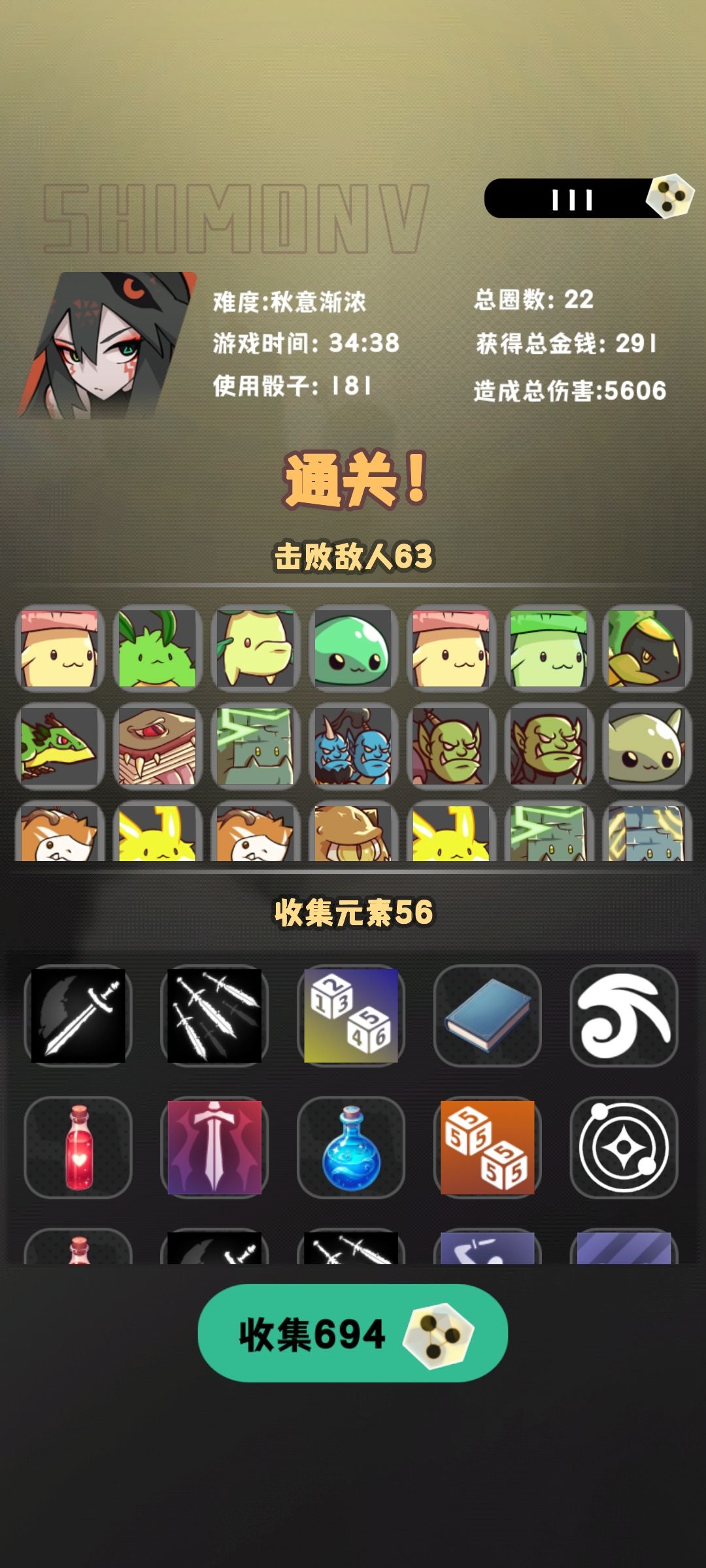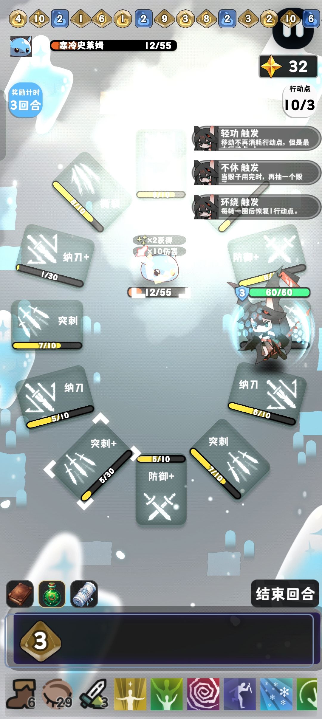 通了,蛮好玩的,可惜个人感觉不太平衡 说下心得吧,最简单暴力的玩法: 人物1,2级3级都行 格子:只要纳刀+突刺,【基本只要红色骰子】 技能:骰子连出+加骰子+加行动力, 红色纳刀+蓄力,加几层去突刺就秒怪了,可以配上紫色骰子双倍伤害 路上小心带刺的怪(怪物贴图中间有个陷阱样子的,有的是死亡伤害,这个不用怕,有的是反伤,建议蓄力层数堆高点再连击) 人物6,3级,需要运气,但是打起来也挺快的 核心: