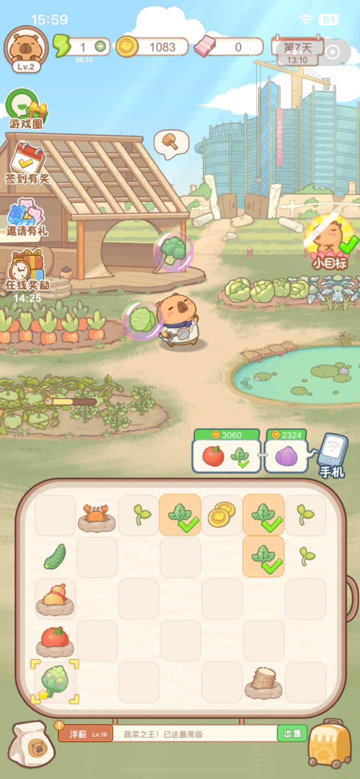2.游戏玩法:玩法也如名字那般,非常休闲简单。通过种田产出的农作物,以相同物品二合一的形式,合成物品,完成各种订单,赚取金币,不断完善自己的家园。过程中也会获取拼图碎片,完成拼图,还可以解锁其他场景,体验其他场景种田的感觉。