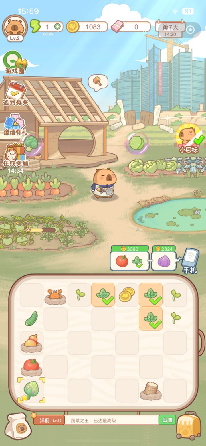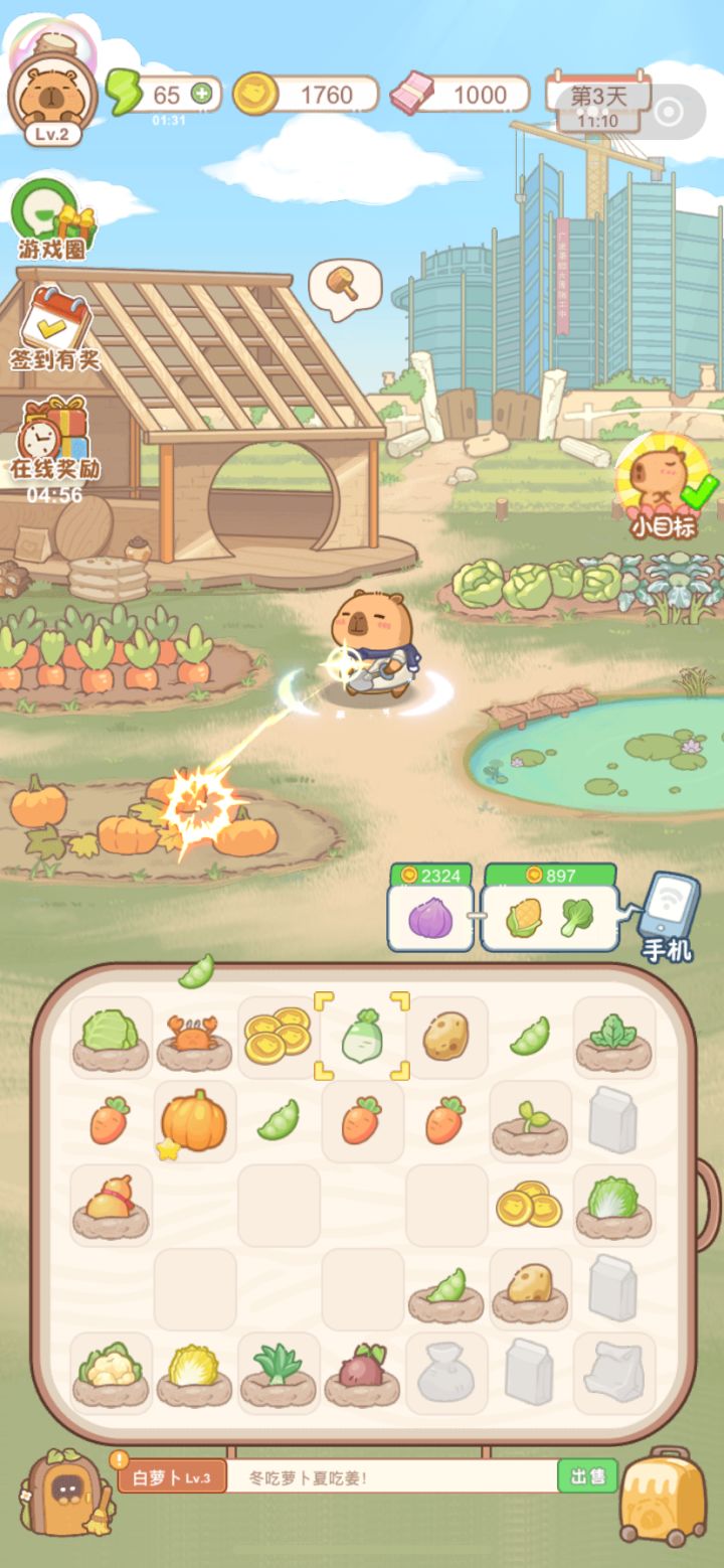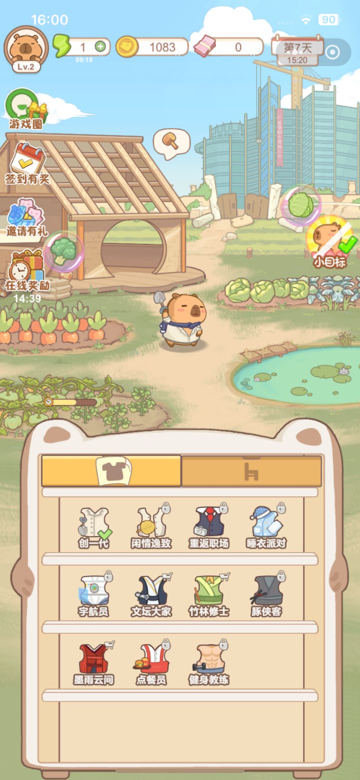 2.主角水豚以及场景都采用了Q萌可爱的设计,整个画面亲切又温馨,并且游戏中的玩法也比较多样,不会显得那么乏味无趣。
