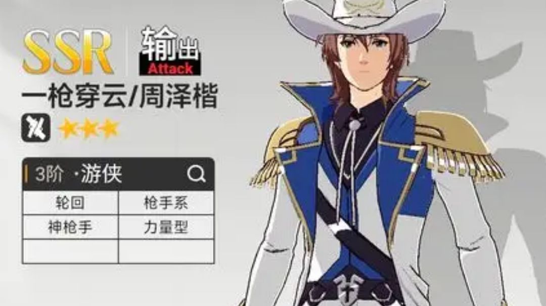 角色定位 一枪穿云/周泽楷是一名输出型角色,职业为枪手系,群攻与单体秒杀能力兼备,是团队中绝对的核心。 角色基本技能(普攻) 速射是周泽楷的基本技能(普攻),无冷却,使用不消耗法力值。满级使用后周泽楷会对对方造成两段共计120%的物理伤害(折合每段60%),且有概率使自身获得一层[急速]。 角色被动 周泽楷被动技能枪王,满级后首个效果为每次释放特殊技能或大招后,下次基本技能造成的伤害提升100%,