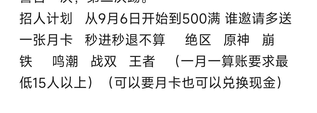 招人计划 从9月6日开始到500满 谁邀请多送一张月卡 秒进秒退不算 绝区 原神 崩铁 鸣潮 战双 王者 (一月一算账要求最低15人以上)(可以要月卡也可以兑换现金