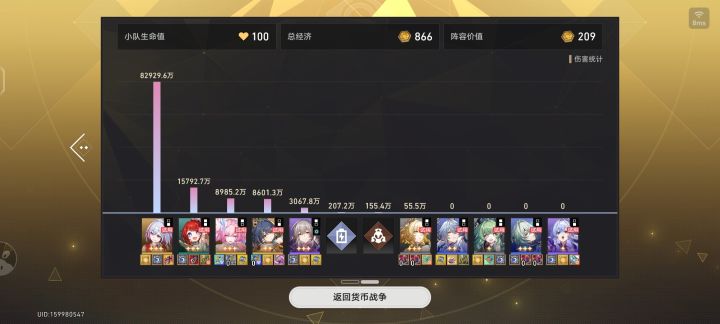 星期日是1+1,202爆伤129速,花火是0+0,189爆伤136速。队伍是记忆主,昔涟,盾丹。昔涟可以提供暴击率和箭雨,至于为什么带盾丹而不是其他生存位是因为盾丹是我XP,我觉得玩记忆主单C就是得带盾丹#崩坏星穹铁道