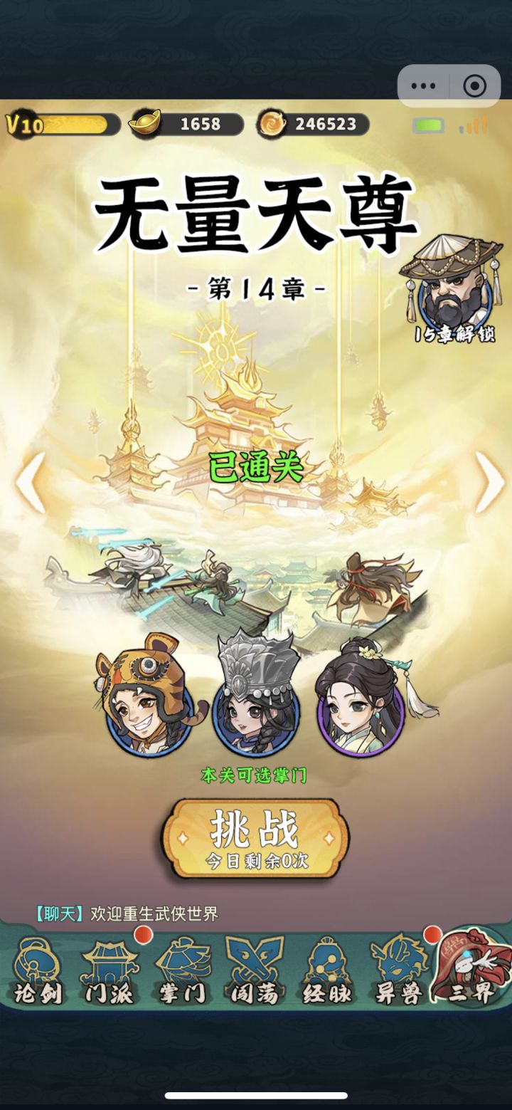 这次是三界第四章,估计明天就能打第五章了。目前玩了这些五级弟子感觉还是李淳罡最稳,装备成型基本都是随便打(克星就是自爆狮王)按这个装备用就是了(龙血蛤>天外匕首>吸血剑 最后的一件装备推荐红装掌门芈月自带红装没有的话就带分身棍或者铁布衫#就行)