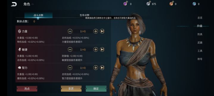 角色养成包括点数分配、防具、武器、工具类和称号。点数分配有战斗点数和生存点数两大类,其中包含若干属性,点数分配有选择策略。防具总共九个不同身体槽位,与武器一样,通过制造获得。武器可装备四把,可以切换着使用,有点像暗黑破坏神的设定。工具对应采集物,没有装配工具的话无法进行资源采集。称号有两个装备槽位,获得之后可以进行佩戴。