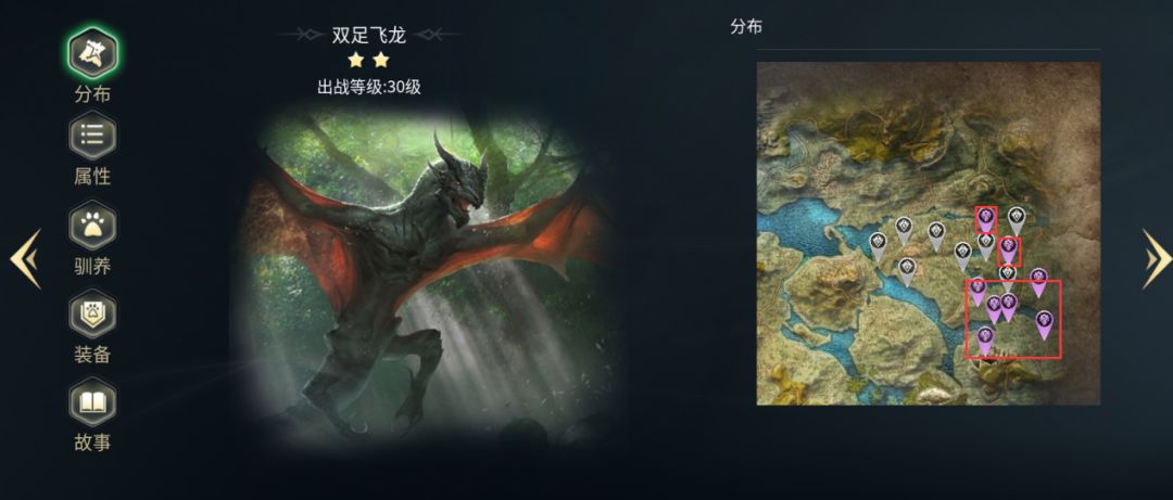 黑光生存进化二星宠物60级刷新点与用途攻略 1、双足飞龙 60级双足飞龙高概率刷新点分布图: 双足飞龙主要用途介绍: 快速代步:游戏世界广阔,双足飞龙作为飞行生物,可帮助玩家快速移动,方便在不同区域之间穿梭,大大提高跑图效率,节省时间和精力。虽然耐力较差,但是速度较快,在短距离快速移动或紧急赶路时非常实用。 2、银月恐狼 60级银月恐狼高概率刷新点分布图: 银月恐狼主要用途介绍: 参与战斗:银月恐