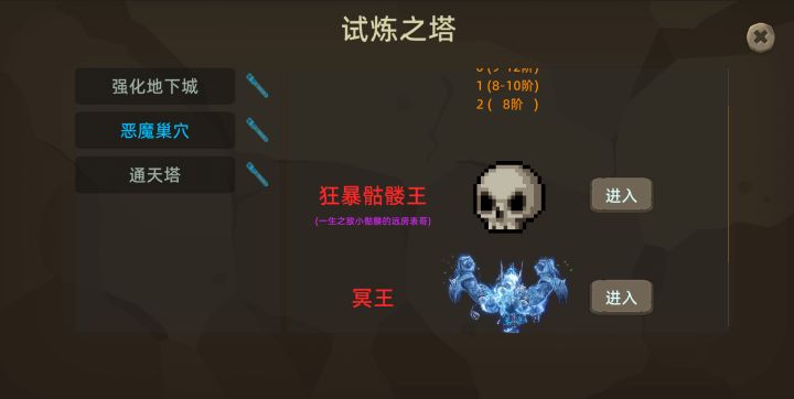 前言:这是一款像素风割草手游,简约而不简陋,核心玩法刷装备词条,割草。标签:多角色,无体力限制,套装,技能,锻造铺,多副本,最高自定义装备,刷刷刷,略肝。准备工作:首先下载最新版本(tap或者进群,群里的更新会快一些),不然下文兑换码给的东西可能会无法获得,新的兑换码也无法使用。开局(初期,第10章前):主界面左下角骷髅头选择角色,默认人物炽天使,开始闯关。击杀关卡内任意怪会提供局内经验(绿
