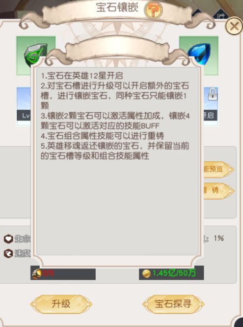 宝石系统玩法:英雄12星时开启,主要通过宝石抽奖进行获得,基础抽奖4500钻=50抽属性分类上分为攻击、防御、辅助3大类,红色5级位最高品质,合成路线是3合 1,配备上不能装备同名宝石宝石推荐:攻击系宝石(攻击百分比、暴击率百分比、增伤百分比都推荐给主C穿)防御系(核心为减伤百分比、生命百分比)辅助系(核心为速度百分比、治疗百分比)宝石获取:推荐在宝石寻宝礼包处购买每周福利,基本可以