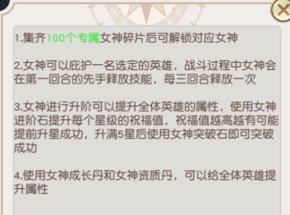 1、女神系统一般在开服7天后开启,随之而来的是对应的限时活动,参与可协助快速提升女神系统战力2、女神系统提升优先级:最优,相较于其他的附加养成系统,女神可以给英雄带来针对性的技能加成,以及影响全局的英雄基础属性,多位女神一起叠加百分比属性加成,效果十分变态; 3、女神获取激活说明:(1) 基础的勇气女神,在系统开放后会解锁赠送对应的100碎片(2) 其他女神获取途径:① 4个橙色品质的女